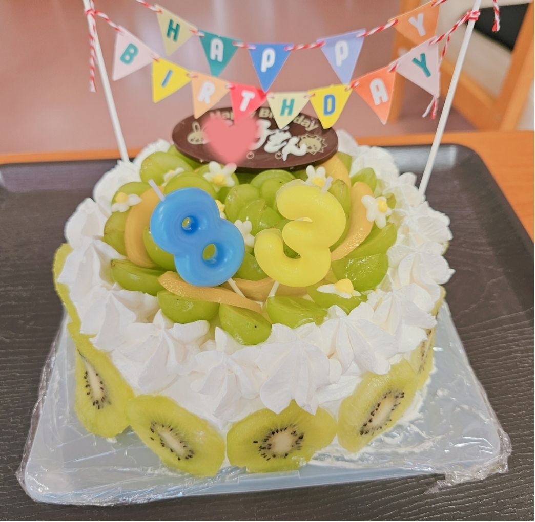 施設に戻ってからは、季節のフルーツを使った大きなバースデーケーキでお祝いしました。