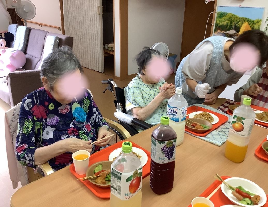 スタッフが衣装から手作りしたオリジナル神楽を披露すると、獅子舞が近づいた瞬間、自然と頭を差し出して噛んでもらう姿が見られ、会場は笑顔でいっぱいに!昼食は縁日風にアレンジし、普段はあまり飲まない甘いジュースで乾杯しました。